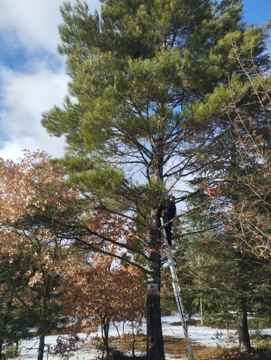 L’après midi, partage de l’équipe entre ébauches de bagues de foulards dans l’atelier, coupe et incinération des cocons accessibles, et aussi répertorier les arbres ayant besoin de pièges et ceux ayant des cocons inaccessibles (mais un sac). Entre deux blizzards, le soleil venait nous faire croire qu’il faisait chaud !