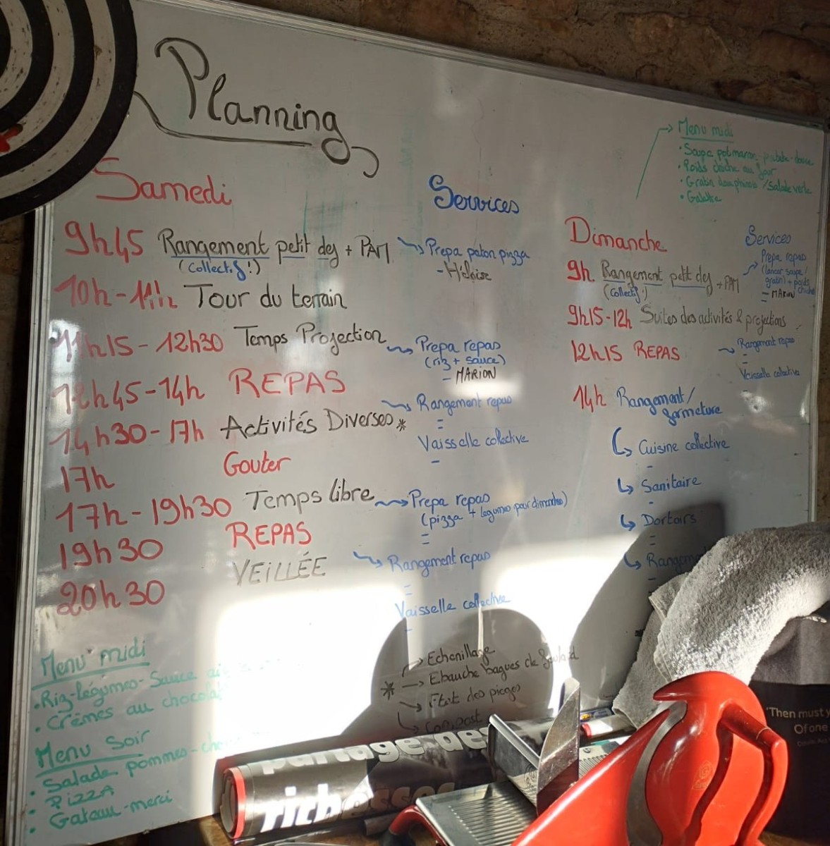 - l’EIDAA, comment faire venir des bénévoles (en faisant du relais sur le camp froissartage et le Rond Poing?), faire vivre l’équipe inter générationnelle au mieux pendant l’été, avec modification du tour du terrain pour arrêter d’utiliser un véhicule à moteur, penser l’accompagnement des groupes, la vie quot à Carda, et organiser les temps de repos.