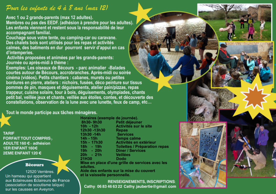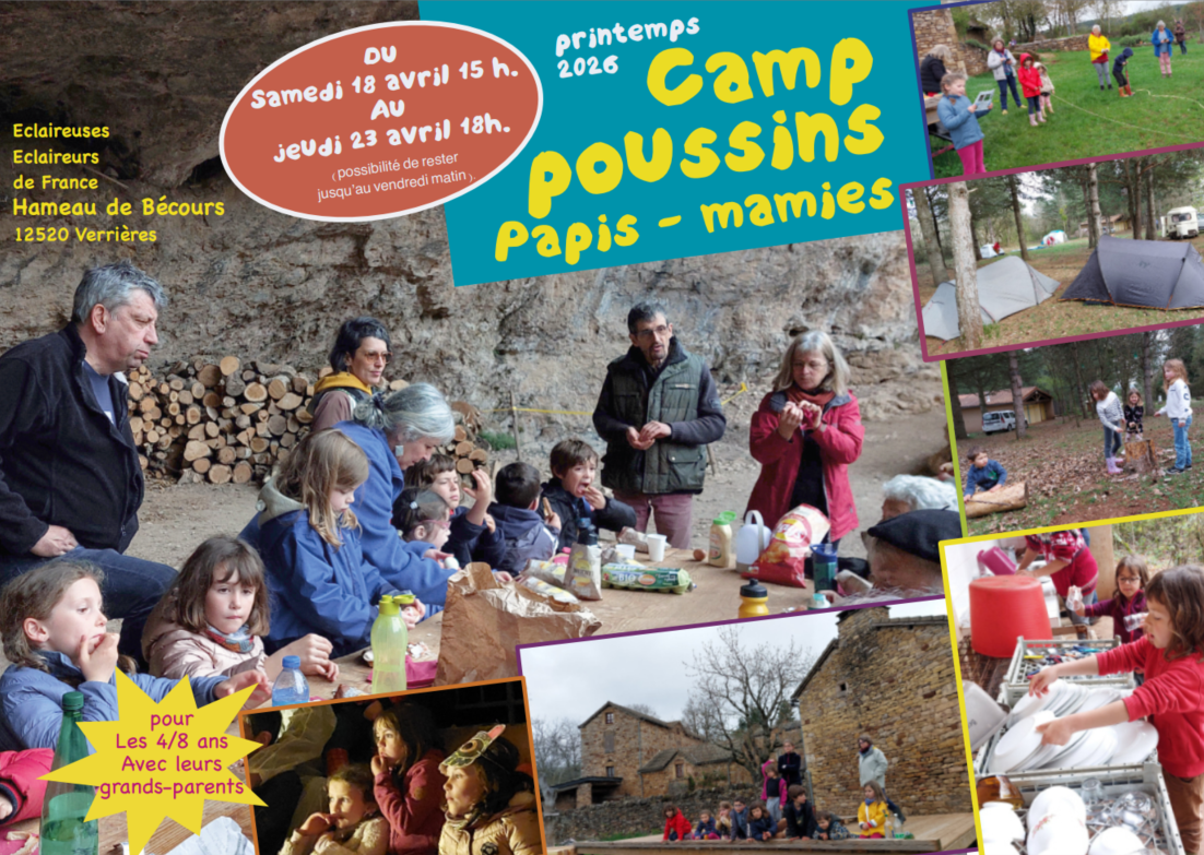 Pendant ce séjour, petit⸱es et grand⸱es réalisent des activités à thèmes (Oiseaux, astronomie, …), des petits chantiers (murets, cabanes, …), des ateliers (pizzas et pain, fusées, nichoirs …), des sorties (Micropolis, Lou Pitchouland, …), on chante, on fait des petites balades autour de Bécours, des veillées, des jeux, et plein d’autres activités ! Bref, un vrai camp de scoutisme adapté aux enfants et à leurs grand-parents ! 🐥